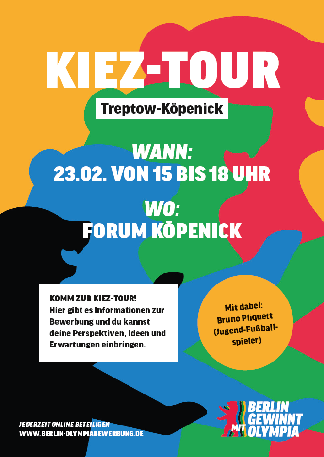 Vor Ort kommen Mitglieder der Steuerungseinheit mit den Berlinerinnen und Berlinern ins Gespräch, beantworten Fragen und nehmen Anregungen für eine mögliche Olympia Ausrichtung auf. Ziel ist es, Ideen, Meinungen und Sorgen aus der Stadtgesellschaft direkt einzubeziehen. Als besonderes Highlight begleiten Bruno Pliquett, Fußballer vom 1. FC Union Berlin, und Oliver Igel, Bezirksbürgermeister die Tour im Bezirk.