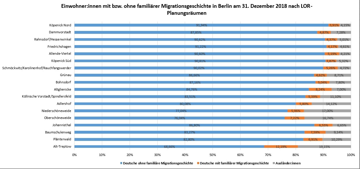Einwohner:innen mit bzw. ohne familiäre Migrationsgeschichte sowie Ausländer:innen in Berlin nach LOR-Planungsräumen