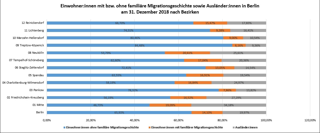 Einwohner:innen mit bzw. ohne familiäre Migrationsgeschichte sowie Ausländer:innen in Berlin nach Bezirken