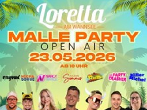 Nach dem überwältigenden Erfolg kehrt eines der angesagtesten Open-Air-Events Berlins zurück! Am 23. Mai verwandelt sich das Loretta am Wannsee erneut in die größte Mallorca-Party der Hauptstadt. Julian Sommer, Lorenz Büffel, Nancy Franck, Killer Michel,... moreabout: Malle Party im Loretta am Wannsee