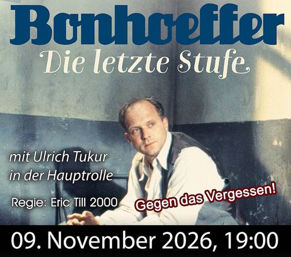 In unserer Reihe „Gegen das Vergessen“ zeigen wir dieses Jahr den Film "Bonhoeffer – Die letzte Stufe" Es ist eine US-amerikanisch-deutsch-kanadische Koproduktion von Eric Till aus dem Jahr 2000 mit Ulrich Tukur in der Hauptrolle.