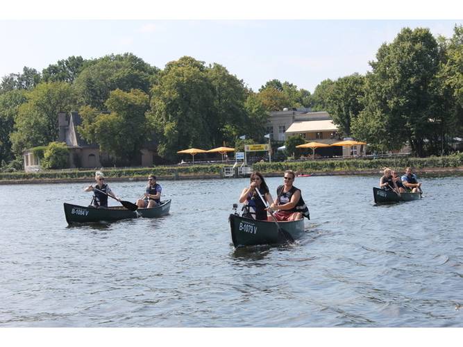Die Route führt südöstlich vom Stadtzentrum über einen Abschnitt der Spree mit zahlreichen Inseln und Buchten. Die Kanutour Wind of Chance startet vom Spreeufer im Funkhaus Berlin. Auf dem ehemaligen DDR-Rundfunk Gelände arbeiteten eins tausende Mitarbeiter für das Funkhaus im Osten. Am gegenüberliegenden Ufer sehen wir zwischen sattem Grün die Überreste des Spreeparks Plänterwald mit dem alles über-ragenden, stillstehenden Riesenrad. Wenn der Wind günstig steht, nimmt der Stahlkoloss mit einem quietschenden Geräusch wieder Fahrt auf. Wir hören die abenteuerliche Geschichte von Nachwende- Rummelplatz-Betreiber Norbert Witte. Dann gleiten wir vorbei am fast 100 Jahre alten Kraftwerk Klingenberg. Kurz darauf erreichen wir die Insel der Jugend. Von dort paddeln wir weiter zur Halbinsel Stralau bis zu einer kleinen Dorfkirche. An dieser Stelle liegt noch heute ein halb versunkender Tunnel unter Wasser, der Anfang des 19. Jahrhunderts für eine Straßenbahnverbindung gebaut wurde. In der DDR war Stralau kein Ort zum verweilen, denn Industrie und Frachtschiffe prägten die Gegend. Heute hingegen ist die Halbinsel eine teure Wohngegend mit direkter Wasserlage von allen Seiten. Selbst Till Schweiger parkt hier öfters sein Boot. Vorbei an der Spitze der Halbinsel erreichen wir als nächstes die Rummelsburgerbucht. Hier befand sich in der DDR ein berüchtigtes Untersuchungsgefängnis der Staatssicherheit, heute beherbergen die roten Backsteingebäude Eigentumswohnungen für junge Familien. Sicherheit: Auf der gesamten Kanutour wird euch ein Guide begleiten, der an interessanten Uferstellen erzählt was es Spannendes zu sehen gibt. Bevor es losgeht, bekommt jeder eine Schwimmweste und einen kurzen Paddelcrashkurs. Für die Wertsachen bekommt jedes Boot Wasserdichte Tonnen. Wer sich für das ehemalige DDR Rundfunkgelände interessiert, kann mit uns auch eine Führung durch das Funkhaus Berlin machen.