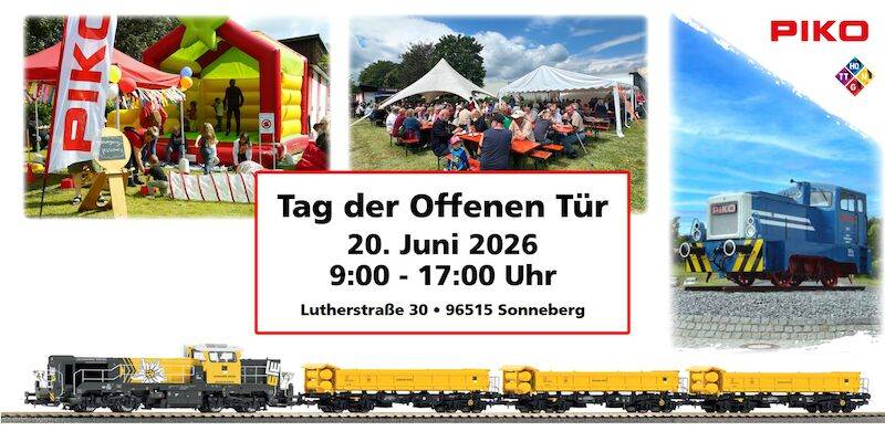 In den Spurgrößen H0 (Maßstab 1:87) sowie G (Maßstab ~ 1:25) bietet PIKO dem Modellbahner ein komplettes Sortiment an. Neben verschiedensten Lokomotiven, Personen- und Güterwagen sowie Gebäudemodellen gibt es mit dem PIKO A-Gleis und dem PIKO G-Gleis alles, was der Modellbahn-freund für sein Hobby benötigt. Erleben Sie hautnah ein breites Sortiment der vier Spurgrößen G, H0, TT und N, schauen Sie den Mitarbeitern in der Produktion der Gartenbahnartikel über die Schulter und treten Sie in regen Austausch mit den Konstrukteuren. Anlässlich des Tages der Offenen Tür werden Sie natürlich auch wieder die Möglichkeit haben, attraktive Sondermodelle sowie vergünstigte 2. Wahl Artikel zu erwerben. Für die kleinen Gästen gibt es zur Unterhaltung zur Unterhaltung eine PIKO Gartenbahn Spielanlage und weitere Spiel-Stationen sowie eine große Hüpfburg. Für Ihr leibliches Wohl ist mit Thüringer Spezialitäten sowie kalten und warmen Getränken bestens gesorgt.