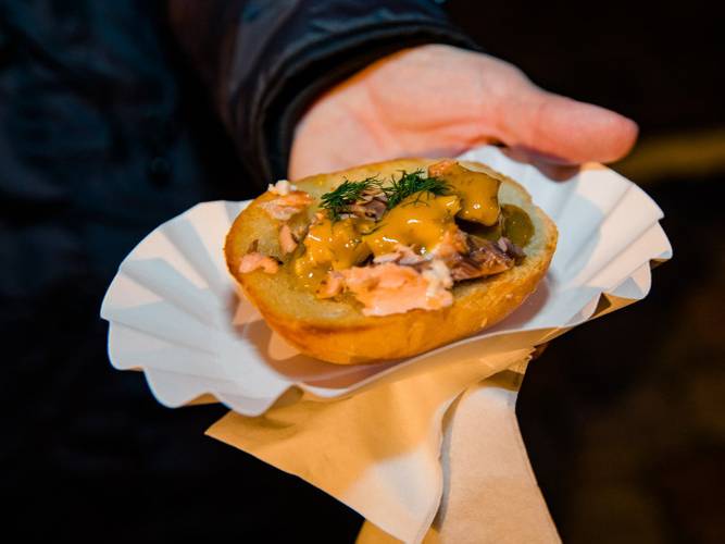 Leberkäse und Rostbratwurst, Spätzle mit Gulasch oder Käse, Finnisches Flammlachs-Baguette mit Meerrettich-Dillsauce