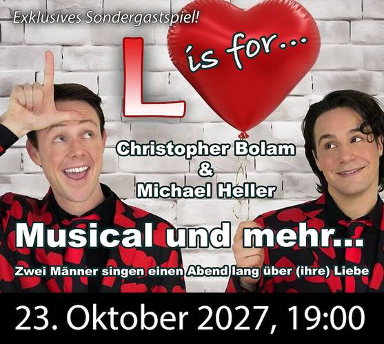 Zwei Männer, ein Abend, unzählige Lovesongs: Michael Heller und Christopher Bolam, das eingespielte Kreativ-Duo der deutschsprachigen Musicalszene, nehmen das Publikum mit auf eine mitreißende Reise durch die Facetten der Liebe.