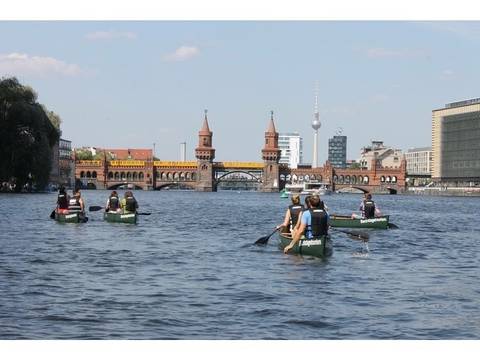 Highlights: • Oberbaumbrücke, mit zwei burgartigen Türmen im Stil der märkischen Backsteingotik • Großskulptur Molecule Men, 30 Meter hoch ragen die drei Figuren aus dem Wasser in den Himmel • Badeschiff – Schwimmen in einem alten Lastkahn, der in der... moreabout: Kanutour Walking on Water