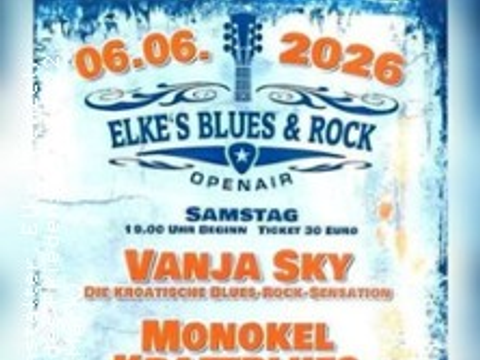 Elkes Blues "N" Rock Open Air Festival mit 3 Bands / Samstag, 06.06.2026 im Garten des Landgasthof Brück. Bühnenprogramm Samstag, 06.06.2026 / Einlass: 17.30 Uhr. 18.30 – 20.00 Vanja Sky. 30 min. Pause - 20.30 – 22.15 Monokel - 30 min. Pause - 22.45... moreabout: Elkes Open Air Festival