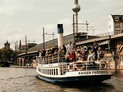 Highlights: • großzügiges Oberdeck über das gesamte Schiff mit gemütlichen Sitzgelegenheiten • kühles Kaiserbier aus Privatbrauerei • wunderschönes, liebevoll restauriertes Schiff • modernster elektrischer Antrieb • älteste Fahrgastschiff Berlins • umweltfreundlich... moreabout: Der Wilde Osten Berlins - Freiheit, Kunst und Clubkultur