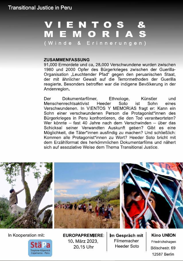 Los geht es am Freitag, dem 10. März 2023, um 20:15 Uhr mit einer europäischen Filmpremiere im Kino Union in Friedrichshagen. „Winde und Erinnerungen“ (Vientos y memorias) heißt der neue Film des peruanischen Anthropologen und Filmemachers Heeder Soto, in dem es um die Aufarbeitung des internen Kriegs in Peru in den Jahren von 1980 bis 2000 geht. In Peru ist der Film bereits angelaufen und hat u.a. auf dem Dokumentarfilmfestival von Lima einen Preis gewonnen. Im Anschluss an die Filmvorführung steht Heeder Soto für ein Publikumsgespräch zur Verfügung. Sie sind herzlich eingeladen!
