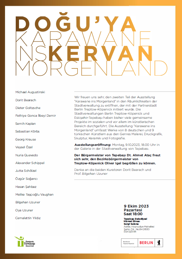 Wir sind sehr stolz darauf, dass es nach den Jahren der Pandemie, die für die Pflege von städtepartnerschaftlichen Beziehungen nicht einfach waren, nunmehr gelungen ist, den zweiten Teil der Ausstellung, nämlich die „Karawane ins Morgenland“ in Eskişehir-Tepebaşı stattfinden zu lassen. Die Ausstellung wird durch die Bürgermeister beider Kommunen im Beisein von sechs Künstler/-innen aus Treptow-Köpenick sowie von neun Künstler/-innen aus Tepebaşı eröffnet werden. Die Vernissage findet am Montag, dem 9. Oktober 2023 um 18 Uhr in der Stadtverwaltung Eskişehir-Tepebaşı statt.