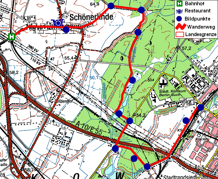 Boden befindet, geht man nach Westen (links) bis zur nächsten großen Kreuzung. Dort befindet sich ein weiterer hölzerner Wegweiser, der in zahlreiche Richtungen weist. Unter anderem auch nach Schönerlinde. Diesem Weg namens “Hobrechtsfelder Weg” wird nun bis nach Schönerlinde gefolgt. Jetzt befindet man sich endgültig im Brandenburger Land. Im Ort gelangt man auf die “Berliner Straße”, der nach Westen (rechts) gefolgt wird. Nun läuft man direkt auf die Schönerlinder Dorfkirche zu.