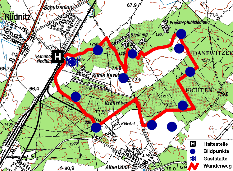 Markierung auf weißem Grund nachgegangen. Zwischen zwei Pferdekoppeln hindurch schlängelt sich der schmale Pfad bis zum Bahndamm. Noch ein kurzes Stück nach Südwesten (links) und man steht wieder am Ausgangspunkt dieser Wanderung. Wer diese Wanderung an einem Wochenende macht, kann sich nach der Wanderung auf dem angrenzenden Reiterhof im Rüdnitzer Reiterstübchen stärken und die Wartezeit auf die Bahn, die einen zurück nach Berlin bringt, verkürzen (Öffnungszeiten Fr. 15-22 Uhr, Sa u. So 10-22 Uhr).