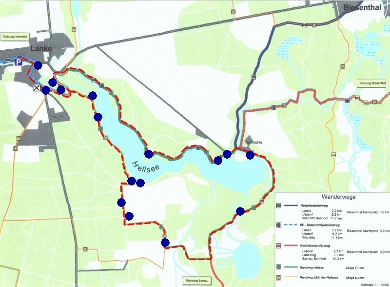 Der Weg führt rechts vom See, beschildert als “Rundweg Lanke Hellsee”, entlang.