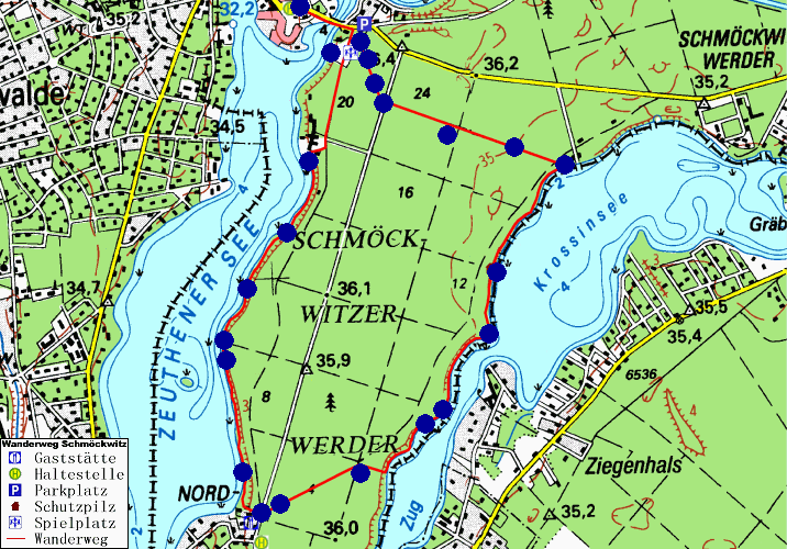 Sowohl die Wanderung als auch der Weg zum Spielplatz beginnen an der Endstation der Straßenbahn 68 in Alt-Schmöckwitz. Weiter auf der Wernsdorfer Straße überquert man die “Dahme” und schon wenige Meter danach erreicht man die Zufahrt auf den Parkplatz, der direkt am Spielplatz endet. Dieser recht kleine Parkplatz ist meistens gut besucht. Deshalb ist es sehr zu empfehlen, die öffentlichen Verkehrsmittel zu nutzen. Nach Erreichen des Parkplatzes überquert man die Freifläche zwischen Spielplatz und Badestrand in südliche Richtung. Auf der anderen Seite führt der Weg schnurgerade in den Wald, vorbei an einem Waldcampingplatz und 150 Meter weiter stößt man auf die asphaltierte Zufahrt des Hotels Teikyo. Weiter nach Süden geht es entlang des Zaunes. Ca. 50 Meter nach dem Ende des Zaunes zweigt ein Weg nach schräg rechts (westlich) ab hinunter an den Uferbereich des Zeuthener Sees. Diesem schattigen markierten Uferweg (gelber Balken auf weißem Grund) folgt man nun bis
