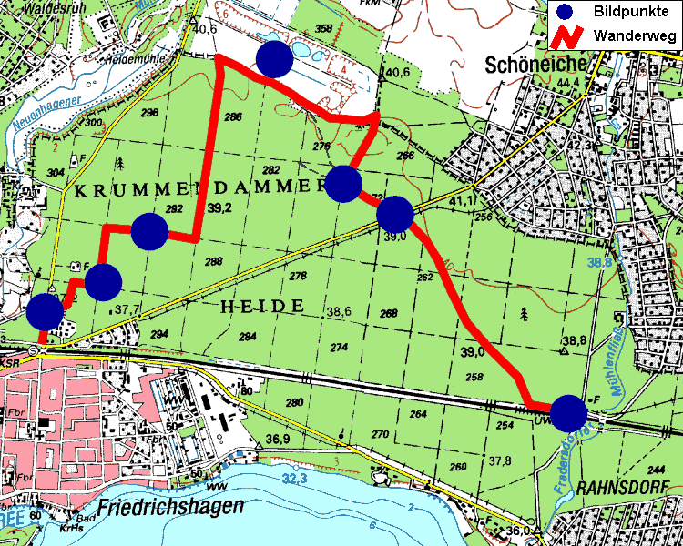 Nach wenigen Metern steht man an einer Kreuzung. Dort geht es weiter geradeaus auf dem durch einen hölzernen Zaun abgetrennten Weg. Parallel verläuft (auf der anderen Seite des Zaunes) ein Reitweg. Hat man am Ende des Weges erneut den Durchgang des Zaunes passiert, befindet man sich auf einer großen Wegekreuzung mit Schutzhütte und Waldkarte. Dieser breite Weg ist der Dahlwitzer Heuweg, dem nach Südosten (schräg links) gefolgt wird. Der Heuweg durchquert die Krummendammer Heide und endet direkt in Rahnsdorf am S-Bahnhof. Bevor dieser jedoch erreicht ist, wird aber erst noch die Schöneicher Landstraße und die parallel verlaufenden Straßenbahnschienen überquert. Auf der anderen Straßenseite wandert man weiter auf dem Heuweg und kommt ein weiteres Mal an einer Schutzhütte vorbei.