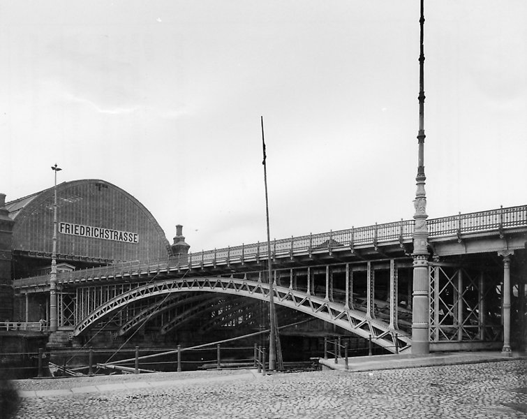 Eisenbahnbrücke über die Spree am Bahnhof Friedrichstraße. Blick vom Schiffbauerdamm/Ecke Albrechtstraße.