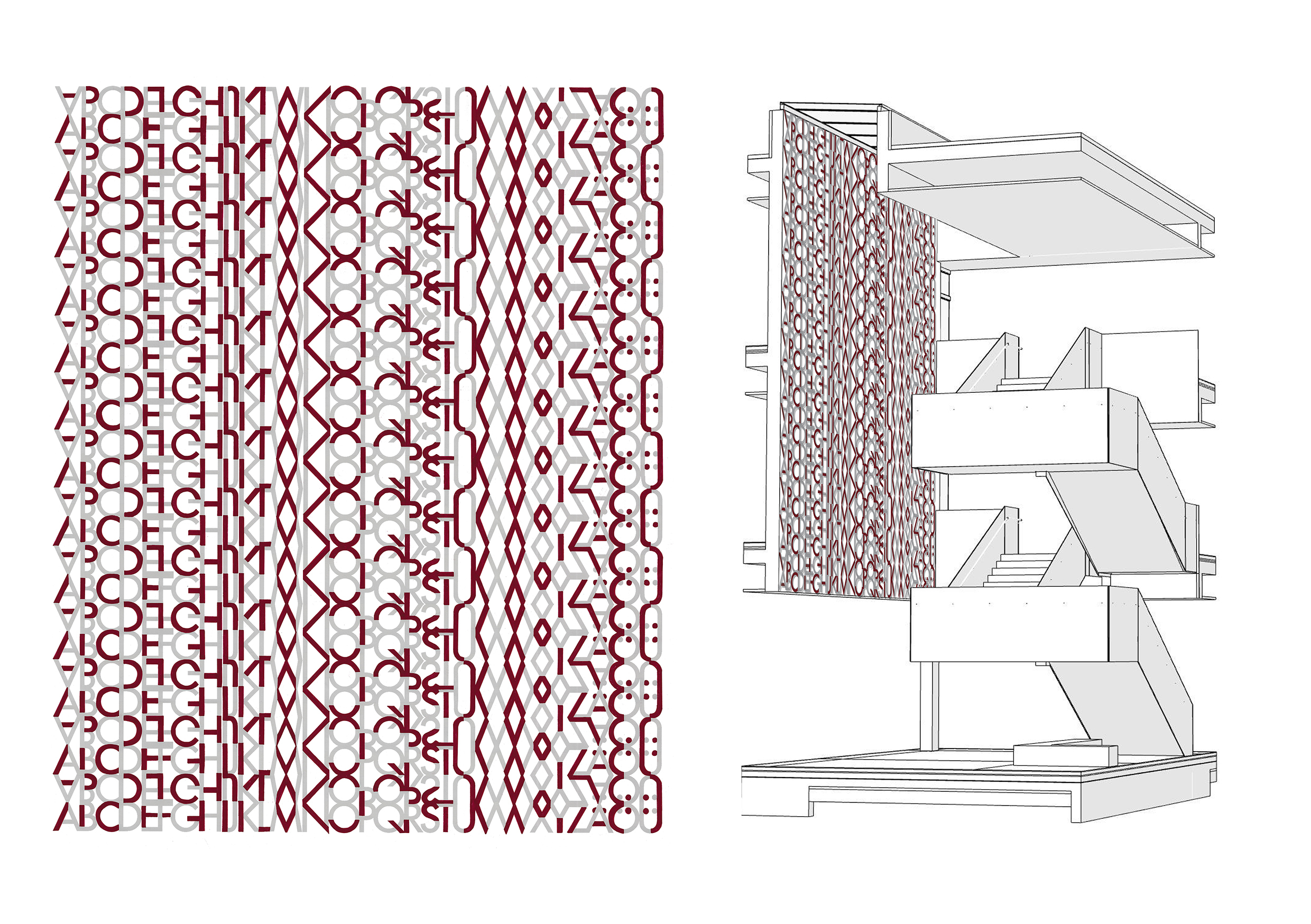 Der Entwurf, der im Eingangsbereich der großzügigen Treppenhalle vorgesehen ist, bildet – so die Beurteilung des Preisgerichts – ein dreidimensionales Gewebe aus partiell farbigen Leicht-Betonbuchstaben, das wie ein vielschichtiges Ornament wirkt. Grundlage der künstlerischen Arbeit ist das Alphabet, das in eine komplexe Struktur transformiert wird und vielfältige Wahrnehmungsmöglichkeiten eröffnet. Es entsteht ein poetisches Bild zwischen Text und Textur. Das Erlernen des Alphabets ist Grundvoraussetzung für Bildung und Emanzipation. Das Preisgericht würdigt damit einstimmig den eleganten und intelligenten Entwurf, der mit der Schule und der Architektur in einen inhaltlich und formal gelungenen Dialog tritt.