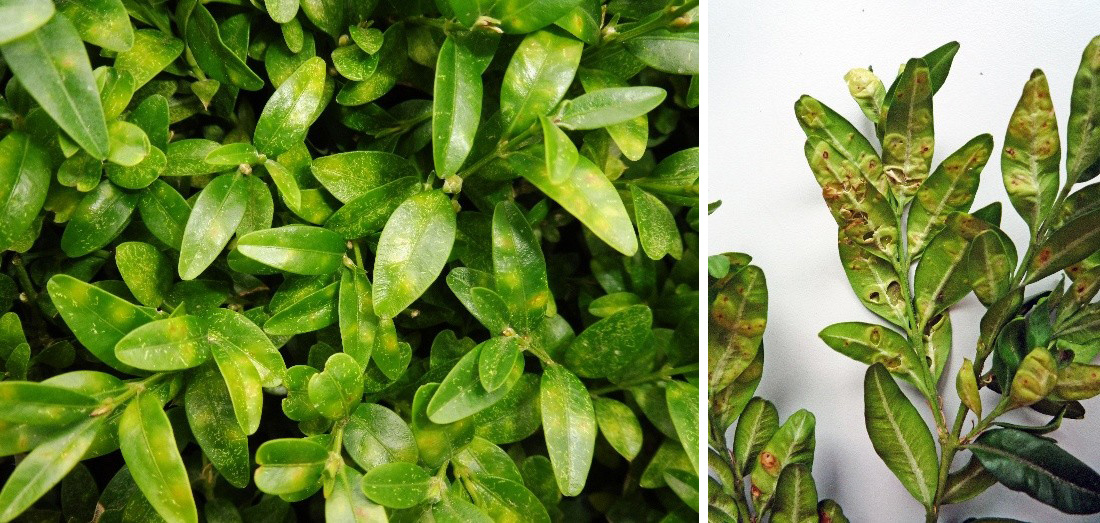 Vom Spätsommer bis zum Herbst bilden sich auf der Blattoberseite des Buchsbaums gelbliche Aufhellungen. Diese weisen keine deutlichen Abgrenzungen zum gesunden Blattgewebe auf. Betrachtet man die Blätter gegen das Licht, lassen sich Hohlräume im Gewebe erkennen, was gegen einen Pilzbefall spricht.