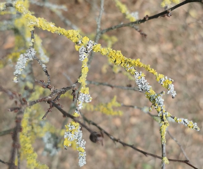 Bei den gelben und hellgrauen blättrigen bzw. fadenförmigen Belägen auf Ästen, Trieben und Zweigen handelt es sich in der Regel um die Graue oder Gewöhnliche Schwielenflechte oder Gelbflechte. Flechten sind eine Symbiose zwischen einem Pilz und einer oder mehrerer Algenarten. Sie gelten als ungefährlich, weil sie nicht in das Gewebe von Pflanzen eindringen. Schäden können jedoch an schwach wüchsigen, überalterten Gehölzen und bei geringer Vitalität auftreten, wenn sie z.B. Knospen überwachsen.