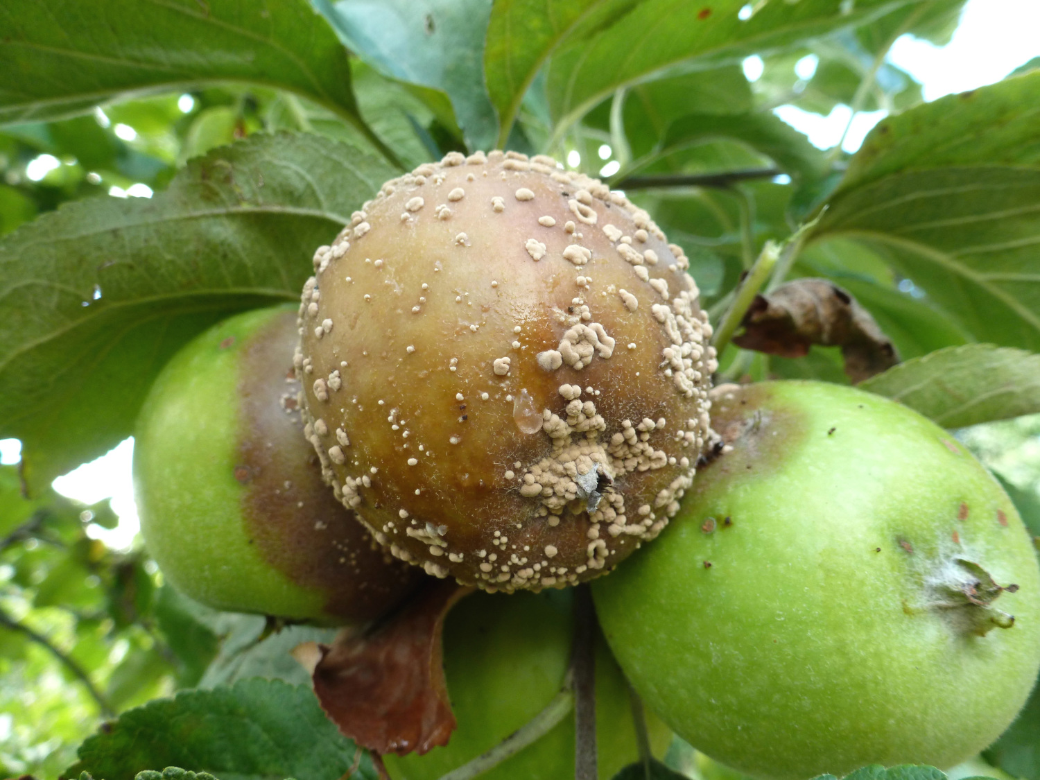 Fruchtfäulen entstehen häufig nach Verletzungen der Äpfel durch die Obstmade (Apfelwickler) oder durch starken Schorfbefall. Über Verletzungen der Fruchthaut dringen dann die Sporen verschiedener Fäulniserreger ein, allen voran die Monilia-Fruchtfäule. Unverletzte Früchte bleiben in der Regel verschont. In jedem Fall sollten Sie alle befallenen Früchte rechtzeitig aus der Krone entfernen, damit benachbarte Früchte nicht auch infiziert werden. Faule Früchte können ohne Bedenken kompostiert werden, wenn das Material gut zerkleinert und mit einer dichten Schicht Erde oder pflanzlichem Material abgedeckt wird. Hierdurch kommt der Rotteprozess rasch in Gang. Mit diesem Abbauprozess des pflanzlichen Materials gehen auch die pilzlichen Erreger zu Grunde. Die an Obst vorkommenden Fäulniserreger sind nicht in der Lage, noch in der Komposterde Dauersporen zu bilden. Mit der Verwendung der Komposterde werden diese Krankheiten also nicht im Garten weiterverbreitet.