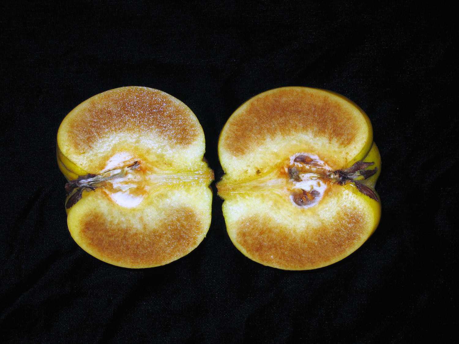 Diese Symptome an Quittenfrüchten treten in den letzten Jahren vermehrt auf. Es handelt sich weder um eine Krankheit noch um Standortprobleme. Als Hautursache wird in den letzten Jahren eine zu späte Ernte der Früchte vermutet. Auffällig war in den letzten Jahren, dass die Vegetationszeit schon deutlich früher begann, als es noch vor 10 bis 15 Jahren der Fall war. Demzufolge setzt bei allen Obstarten der Zeitpunkt der optimalen Pflückreife deutlich früher ein, als dies noch in der älteren Fachliteratur angegeben wird. Wartet man aber zu lang mit der Ernte, beginnen die Früchte zu altern und ein Abbauprozess der Inhaltsstoffe kommt in Gang. Dies führt auch zur Verbräunung des Fruchtfleisches. Dies gilt nicht nur für Quitten, sondern auch für Birnen und Äpfel. Deshalb ist die beste Methode dieser Verbräunung der Früchte zu entgehen ein frühzeitiger Erntezeitpunkt.