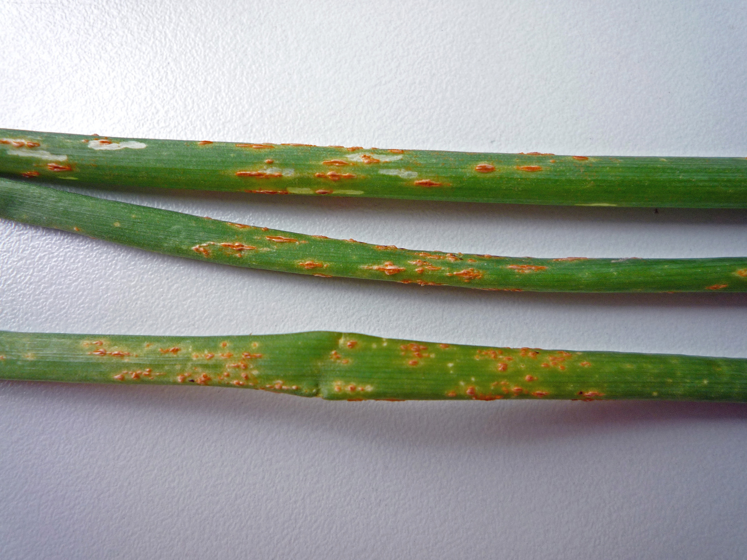 Hierbei handelt es sich um den Schnittlauchrost. Es kann sich dabei um unterschiedliche Erreger handeln. Die typischen orangeroten Pusteln sind erst im Spätsommer und Herbst erkennbar. In dichten Beständen wird der Befall durch das herrschende Mikroklima begünstigt, der Pilzkomplex entwickelt sich optimal zwischen 10 und 24 °C bei hoher Luftfeuchte. Wintersporen überdauern an abgestorbenen Pflanzeteilen. Erkrankte Blätter sind ungenießbar. Beim Erkennen von Symptomen sollte der Bestand zurückgeschnitten und die Versorgung mit Stickstoff zu Gunsten von Kalium optimiert werden. Auch ein luftiger Standort trägt zur Befallsminimierung bei.
