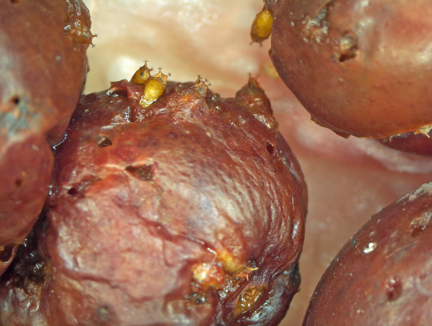 Bei den schwarzen “Fliegen” handelt es sich um Trauermücken, deren Larven im Boden als kleine, etwa 3-5 mm lange, fast durchsichtige Würmer leben. Die Larven der Trauermücken ernähren sich von Feinwurzeln und organischer Substanz. Organischer Dünger (Guano, Hornspäne, Blutmehl, Neemkuchen, u. ä.), Wärme und gleichmäßige Feuchtigkeit begünstigen ihre Vermehrung.