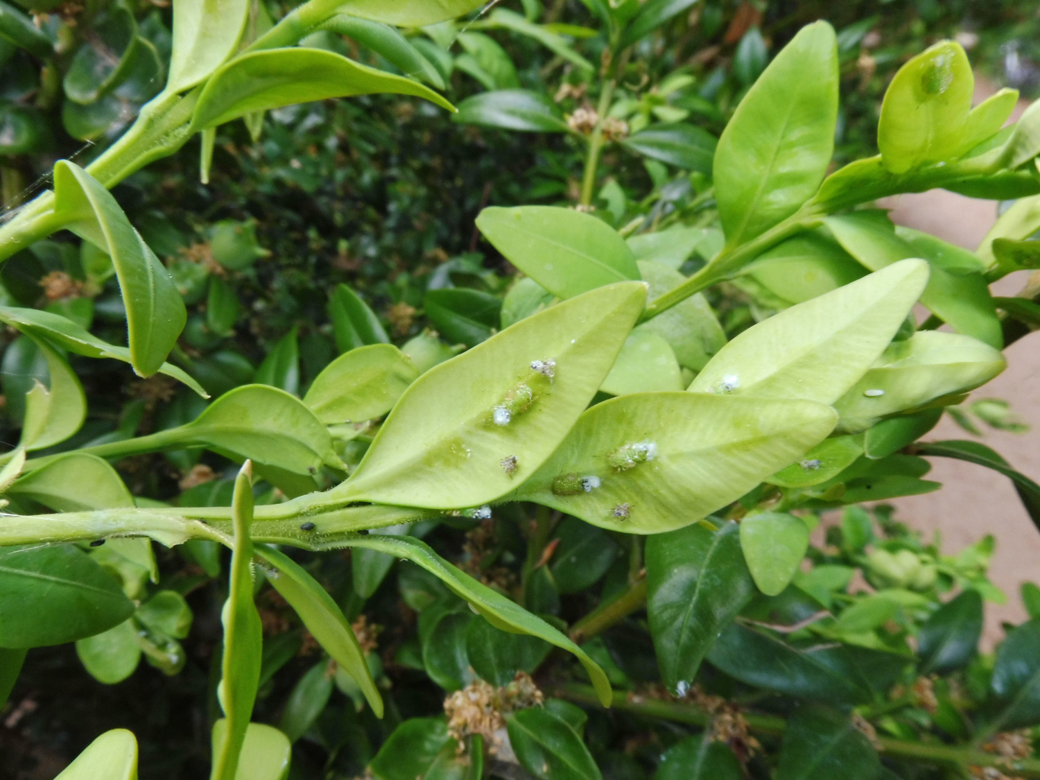 Die löffelartigen Blattdeformationen an den jungen Triebenden werden durch den sogenannten Buchsbaumblattfloh verursacht. Die Tiere überwintern als Larven unter einer schützenden Wachsschicht. Sobald im Frühjahr die Temperaturen ansteigen, werden auch die Larven aktiv und sorgen durch ihre Saugtätigkeiten an dem noch jungen Pflanzengewebe für die typischen Blattveränderungen. Darüber hinaus sind die weißen, watteartigen Ausscheidungen der Larven ein auffälliges Merkmal dieser Tiere. Die ausgewachsenen rund 3 mm großen Tiere sind geflügelt, hellgrün und aufgrund ihrer Sprungbeine äußerst lebhaft. Bei einem geringen Befall reicht ein Rückschnitt aus um die Larven zu bekämpfen. Bei starkem Befall kann auch mit einem systemischen Insektizid eine Bekämpfung vorgenommen werden.