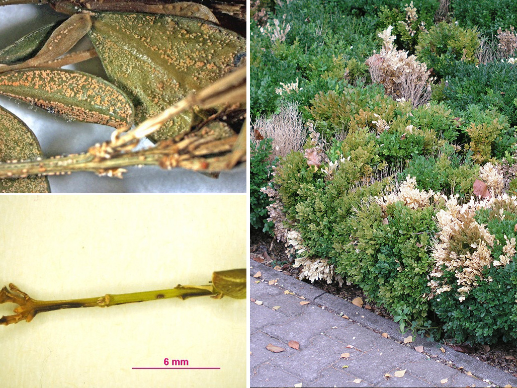 Buchsbaumkrebs: Schadbild an den Blättern, Stielen und der gesamten Pflanze