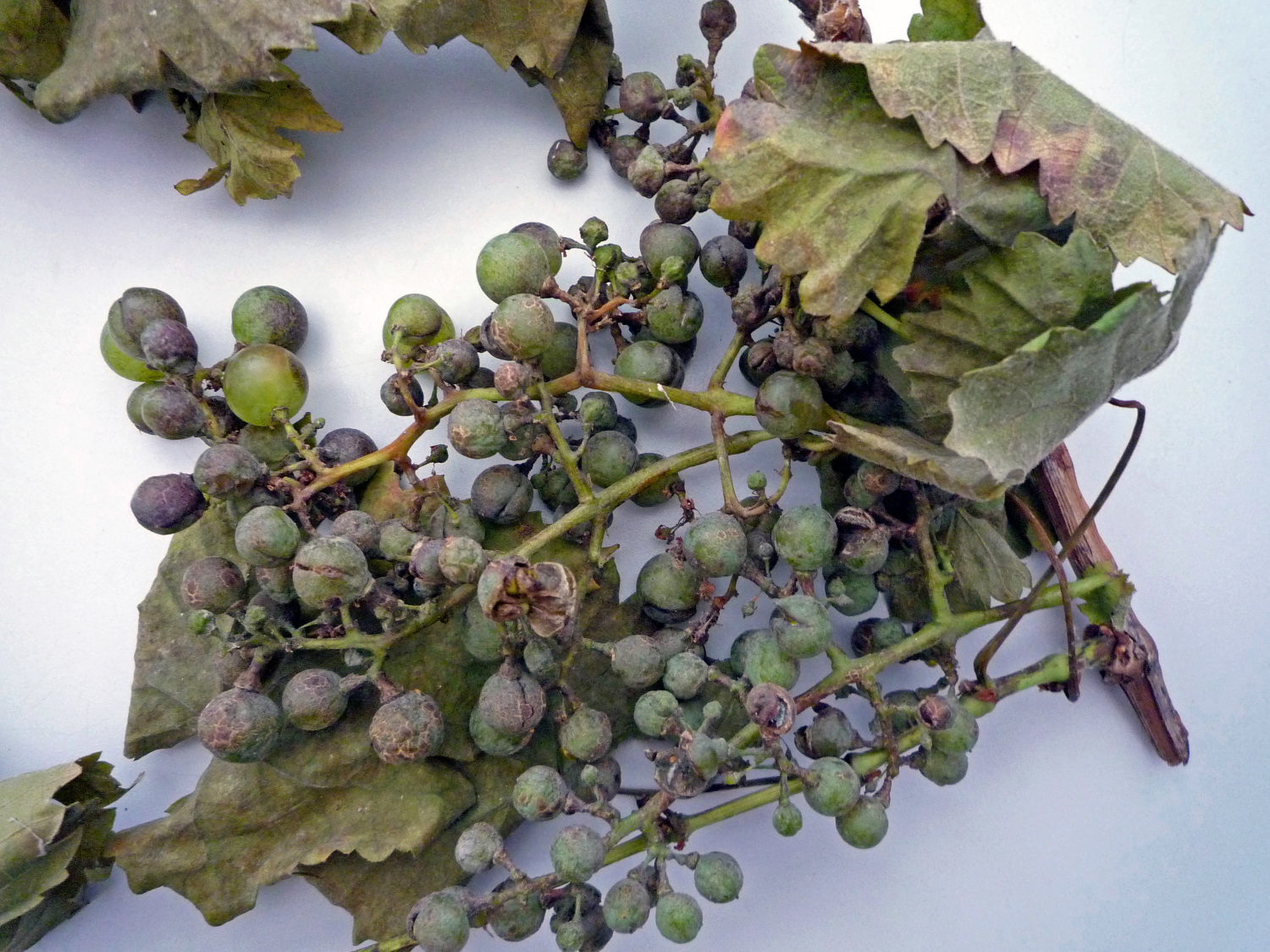 Das vorzeitige Vertrocknen unreifer Beeren hingegen ist ein typisches Symptom für den Befall durch den Falschen Mehltau (Peronospora). Da die Krankheit meist in feuchten Jahren im Frühjahr erste Infektionen am Laub verursacht und von hier aus Infektionen an die noch unreifen Beeren erfolgen, sollten rechtzeitig vorbeugend schützende Spritzbehandlungen ab Blattaustrieb erfolgen. Je nach Wetter müssen in feuchten Jahren Wiederholungsbehandlungen bis zur Erreichung der endgültigen Beerengröße vorgenommen werden. Insbesondere Handelspräparate mit dem Wirkstoff Kupferoktanoat sind hier zugelassen. Leider stehen in den Baumschulen kaum neue Rebsorten zur Verfügung, die gegen den Falschen Mehltau ausreichend widerstandsfähig sind.