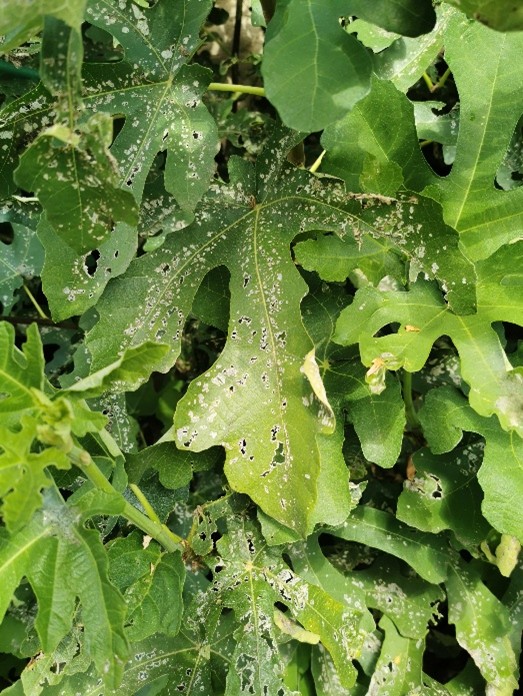 Die Schäden an Ihrer Feige wurden vermutlich durch die Raupen des Feigenspreizflügelfalters verursacht, einem Schadschmetterling, der erstmals 2024 in Berlin aufgetreten ist. Der ursprünglich aus dem Mittelmeerraum stammende und mit Pflanzen eingeschleppte, braunrote Schmetterling breitet sich dank steigender Temperaturen in Deutschland aus.