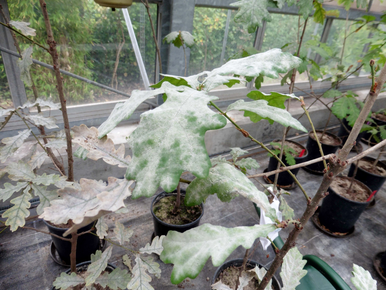 Der weißliche Belag wird durch den Eichenmehltau verursacht. Der zu den Echten Mehltaupilzen zählende Erreger ist sehr wirtsspezifisch. Das heißt, der Eichenmehltau geht weder auf benachbarte Rosen noch auf Stauden über. Diese Pflanzen werden durch andere spezielle Mehltauerreger infiziert. Eine Bekämpfung des Eichenmehltaus ist nicht erforderlich, da der Pilzbelag nur äußerlich an den Blättern anhaftet und die Ernährung der Blätter nur bedingt einschränkt, den Baum jedoch nicht zum Absterben bringt.