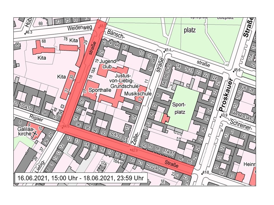 Das Abstellen von Kraftfahrzeugen (auch solchen mit Sonder- und Ausnahmegenehmigungen gem. StVO, darunter auch Elektrokleinstfahrzeuge), Fahrrädern, motorisierten Zweirädern oder mobilen Behältnissen (insbesondere Kleidercontainer, Müllbehälter etc.) auf dem öffentlichen Straßenland des bezeichneten Bereichs ist für den beschriebenen Zeitraum untersagt. Bereits dort abgestellte Gegenstände im Sinne des vorstehenden Satzes, sind in den genannten Zeiträumen vom öffentlichen Straßenland des bezeichneten Bereichs zu entfernen. Auch im Fall einer widerrechtlichen Entfernung der zugehörigen Verkehrszeichen, wird um Beachtung der Einschränkung gebeten.