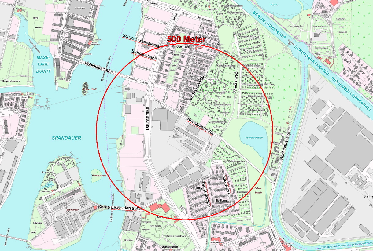 Aufgrund der geplanten Entschärfung einer Fliegerbombe müssen Anwohnende und Gewerbetreibende am 6. November 2021 in Haselhorst mit Einschränkungen rechnen. Der rund 100 Kilogramm schwere Munitionskörper wurde bereits am 3. November 2021 bei Erdaushubarbeiten in der Rhenaniastraße gefunden. Da von der Bombe keine Gefahr ausgeht, wurde die Entschärfung auf Samstag terminiert, um Einschränkungen möglichst gering zu halten. Hierfür ist es notwendig, eine Sicherheitszone mit einem 500 Meter großen Sperrradius um den Fundort herum einzurichten.