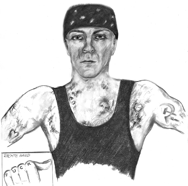 - Wer kennt die auf dem Phantombild abgebildete Person oder kann Hinweise zu einer Person mit den beschriebenen Tätowierungen geben?