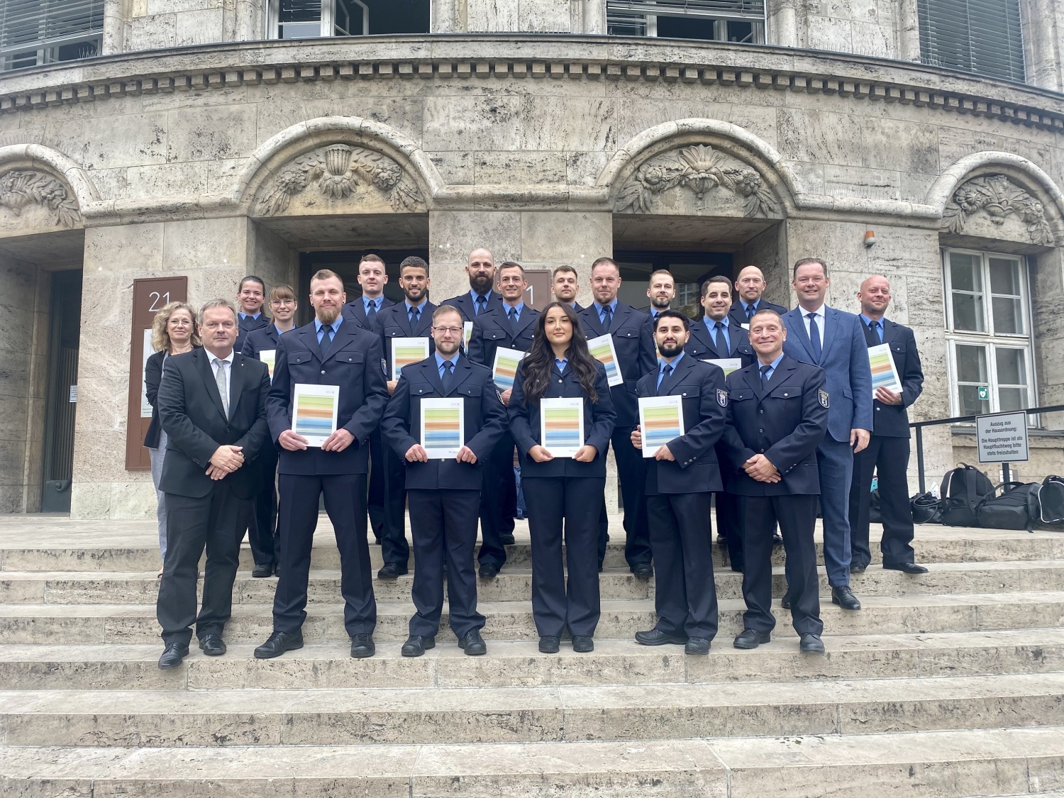 Nach erfolgreichem Abschluss ihrer zweijährigen Ausbildung haben in dieser Woche 20 Anwärterinnen und Anwärter die Laufbahnprüfung für den Allgemeinen Vollzugsdienst an Justizvollzugsanstalten bestanden. Nach der Zeugnisaushändigung durch den Staatssekretär für Justiz Dirk Feuerberg erhielten die Absolventinnen und Absolventen ihre Urkunden, mit welchen sie zu Beamtinnen und Beamten auf Probe ernannt werden. Sie treten nun ihren Dienst in der JVA Heidering, der JVA Moabit, der JVA Tegel, der JVA Plötzensee und der JVA des Offenen Vollzugs Berlin an.