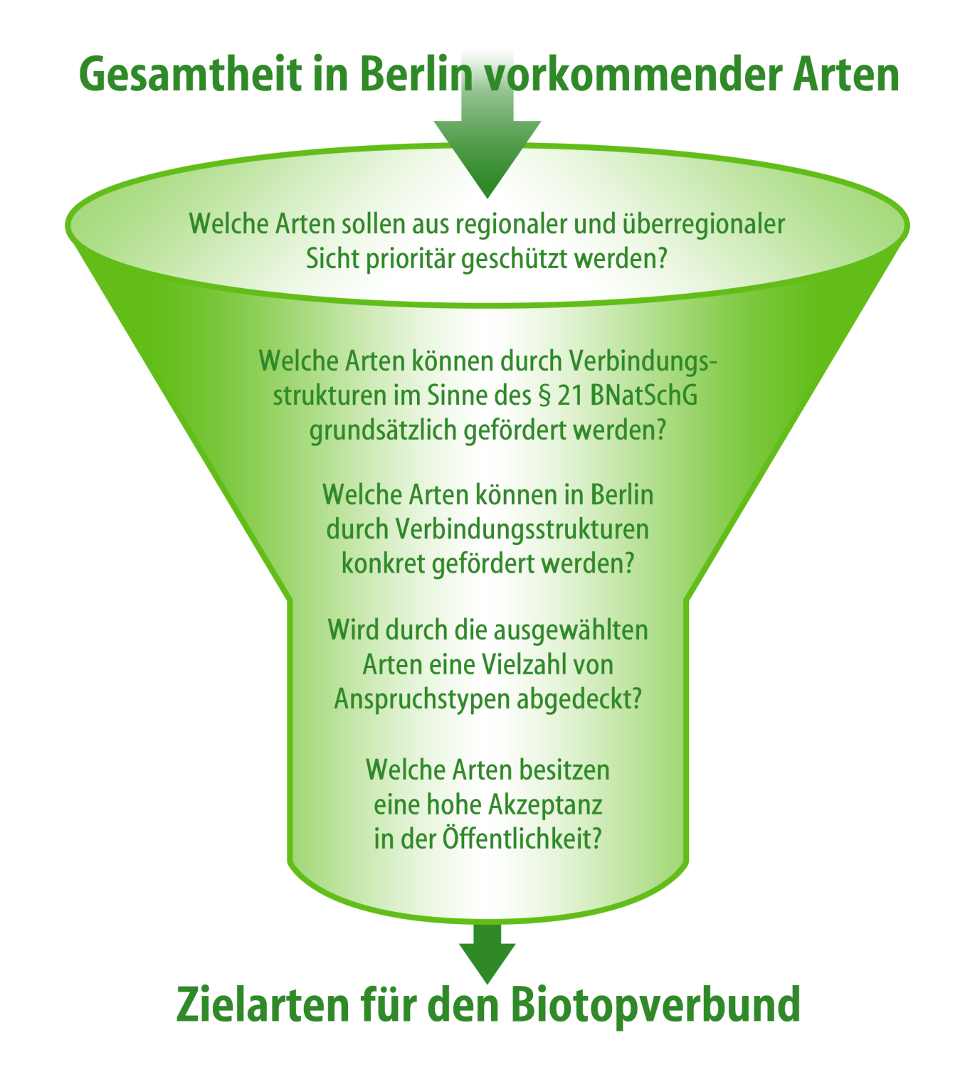 Aufgrund der speziellen Bedingungen in Berlin konnten für die Entwicklung des Biotopverbundes die für die Flächenländer entworfenen Kriterien des Bundesamtes für Naturschutz nicht übernommen werden. Auch die Vorschlagsliste bundesweit relevanter Zielarten war für Berlin nicht anwendbar, da beispielsweise knapp die Hälfte der bundesweit bedeutsamen Zielarten in Berlin als ausgestorben oder verschollen gelten. Vögel und Fledermäuse wurden bei der Zielartenauswahl für das Land Berlin nicht berücksichtigt, da für die meisten Arten aufgrund der hohen Mobilität keine „Barrieren“ im klassischen Sinne existieren.