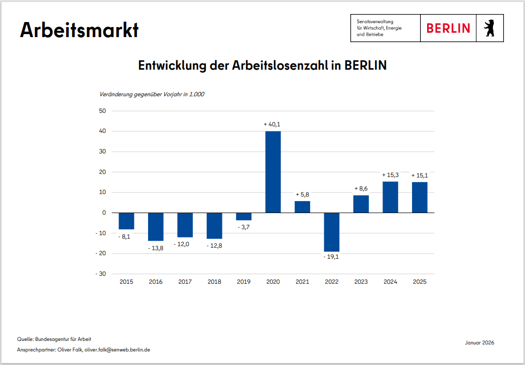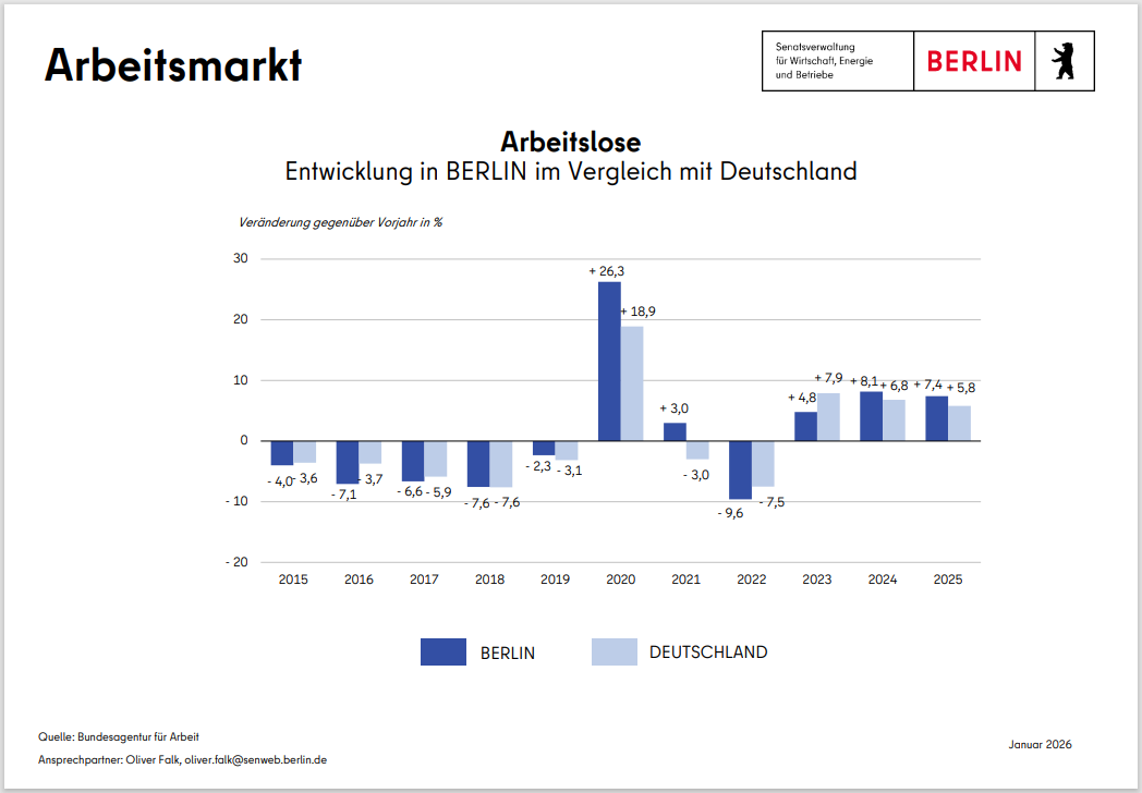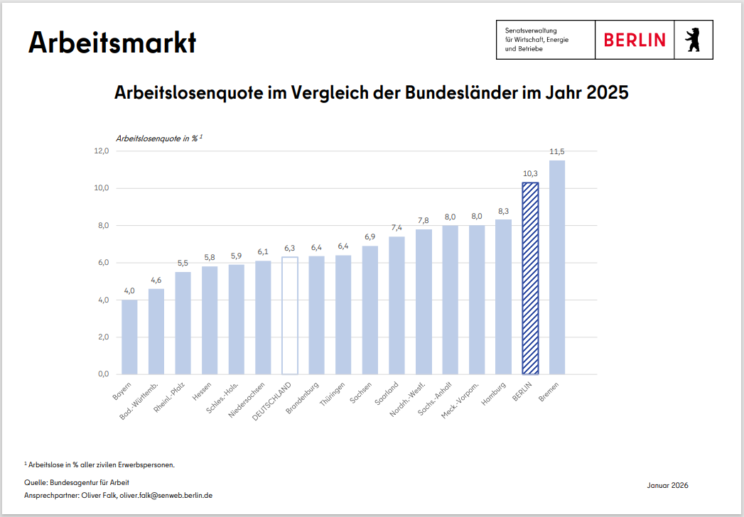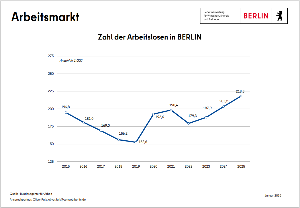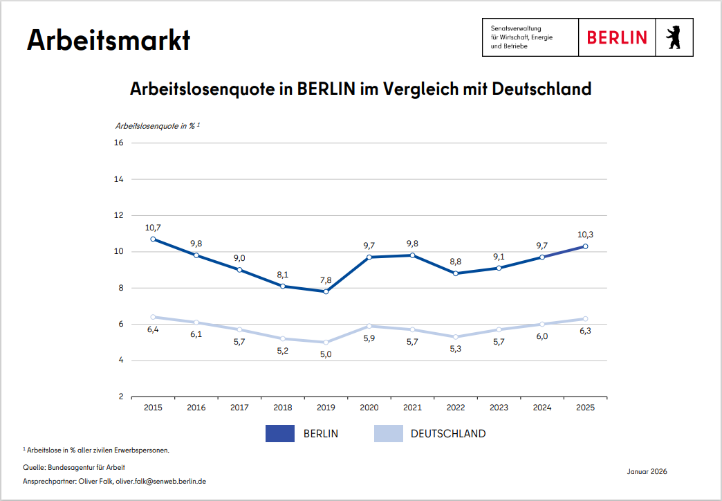 Das wirtschaftliche Wachstum kommt bei den Berlinerinnen und Berlinern an. Die Arbeitslosigkeit hat sich seit ihrem Hochpunkt 2005 im Zuge der günstigen wirtschaftlichen Entwicklung deutlich zurückgebildet. Infolge der multiplen Krisen (Corona, Ukraine-Krieg) bewegt sich die Arbeitslosigkeit am aktuellen Rand allerdings wieder auf einem höheren Niveau.
