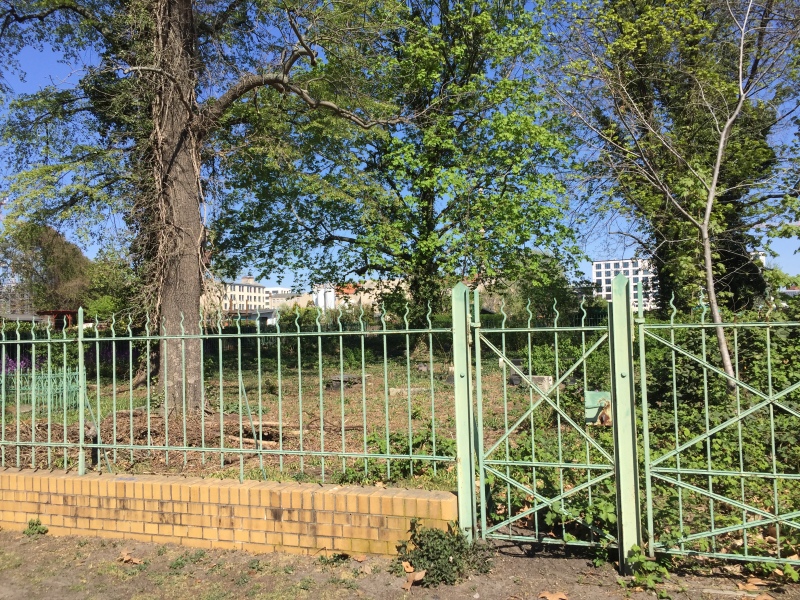 Mit Eintritt durch eins der grünen Tore werde ich von einer unerwarteten Weite und Farbenvielfalt überrascht. Liebevoll gestaltete Gärten, blühende Hecken, Sträucher und der Blick auf die entstehende Europacity erwarten mich. Der Weg durch die Gärten führt zu einem verwilderten Friedhof. Verwitterte Grabplatten, manche aus dem wuchernden Gestrüpp befreit, liegen dort rund um ein paar Bäume und erinnern an die Mitarbeiter der ehemaligen Haftanstalt. Im Hintergrund entsteht die Zukunft. Die ersten fertigen Gebäude des neuen Quartiers am Hauptbahnhof sind durch die Baumkronen zu sehen.