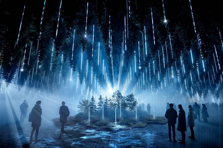 Die Kunsthalle von Dark Matter verwandelt sich in einen begehbaren Wald im Wandel der Jahreszeiten. Die Installation verbindet Naturmotive, industrielle Architektur und kinetische Lichtkunst zu einer vielschichtigen Komposition.