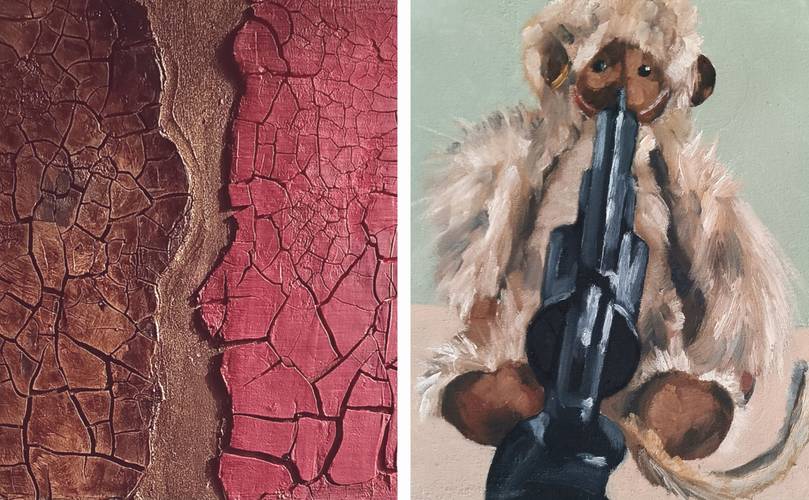 Stefanie Unger macht Papierarbeiten in Mischtechnik zum Thema Krieg und da betont sie klar Antikrieg. Ihre Arbeiten bewegen sich in den Spannungsfeldern: Die dem Krieg eigene Ästhetik & Faszination, zumindest für einige Menschen, im Gegensatz zu seinem Grauen, seiner Unmenschlichkeit & Brutalität, kurz Schönheit wider Grauen: In diesem Spannungsfeld bewegen sich ihre Arbeiten. Welches Wunderland wollen wir: das des Grauens oder das der Schönheit?