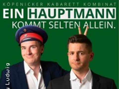 Ein Hauptmann kommt selten allein Kabarett im Altstadttheater Köpenick mit Martin Valenske und Henning Ruwe. Hauptsache Stimmung in Köpenick! Gute Laune sollte nicht dem Zufall überlassen werden, daher ist es höchste Zeit für brandaktuelles Kabarett... mehrzu: Ein Hauptmann kommt selten allein