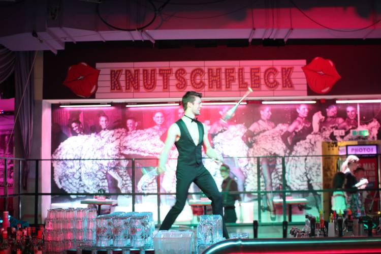 In der angesagtesten Bar Berlins dem Knutschfleck Variete mit Sommernachts Terrasse am Alexanderplatz könnt ihr entspannt zu Live-Musik, buntem Show-Variete Party, Karaoke, leckeren Cocktails oder Deutscher Küche den Abend genießen.