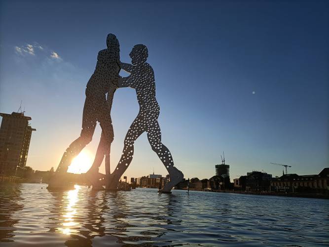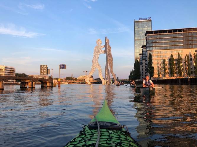 Während die Sonne auf dem Rückzug ist, geht es weiter Richtung Molecule Men. Auf der entspannten Kanu/Kajak Tour kann die atemberaubende Aussicht auf Berlin im Sonnenuntergang genossen werden. Ein erfahrener Guide begleitet die Gruppe und erzählt viele interessante Dinge über die Stadt oder schweigt zusammen mit den Teilnehmer:innen - ganz wie gewünscht. Paddel - und Sicherheitstips inklusive :)