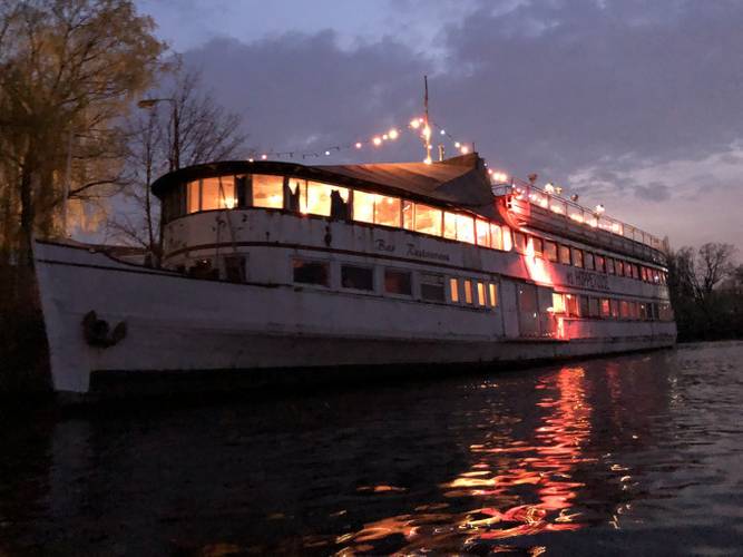 Der Trubel des Tages zieht sich langsam zurück, während Teilnehmer:innen entspannt am Plänterwald entlang, Richtung Insel der Jugend, paddeln.