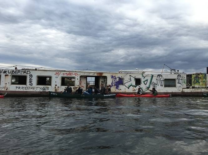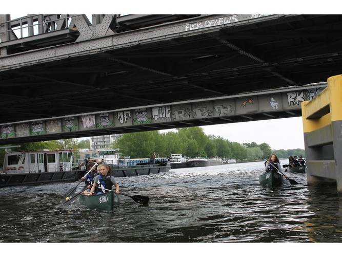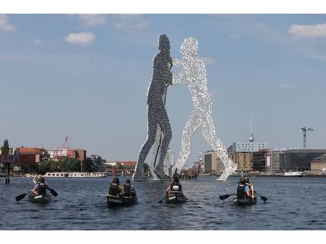 Dann paddeln wir unter der Elsenbrücke hindurch, über uns donnern Regionalzüge, S-Bahnen und Autoverkehr auf 6 Spuren. Hinter der Brücke sehen wir am Horizont die Oberbaumbrücke, eindrucksvoll mit zwei burgartigen Türmen im Stil der märkischen Backsteingotik. An der Großskulptur „Molecule Men“ stoppen wir kurz. Die 30 Meter hohen Männer aus Aluminium scheinen leichtfüßig über das Wasser zu laufen und reichen sich die Hände. Einige hundert Meter weiter passieren wir ein heruntergekommenes Schiffswrack – und hören die unglaubliche Geschichte, wie es dort hinkam und warum es bis heute dort liegt.