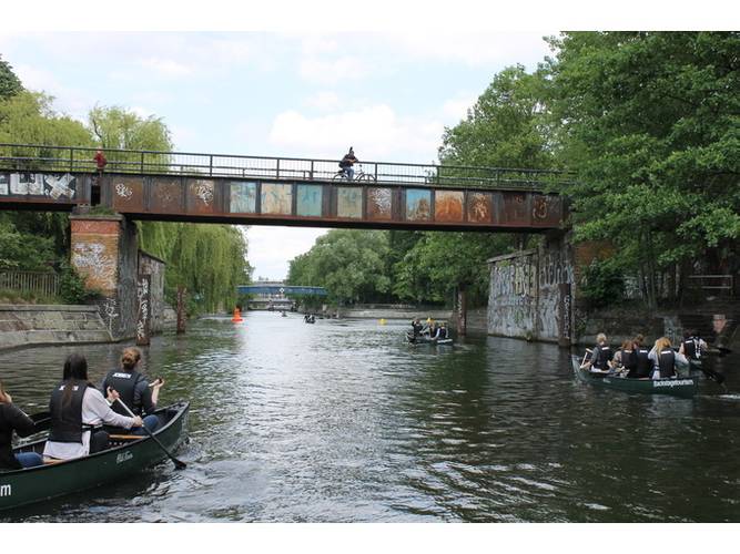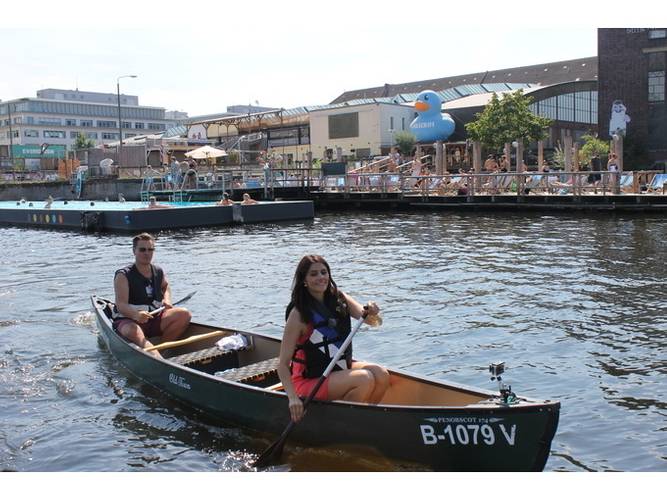 Vom Funkhaus Berlin paddeln wir stadteinwärts, immer den Fernsehturm vor Augen bis nach Kreuzbergs. Als erstes passieren wir den ehemaligen Freizeitpark "Spreepark" und hören die abendteuerliche Geschichte des Nachwende-Betreibers Norbert Witte. Kurz darauf erreichen wir die Insel der Jugend. Von dort paddeln wir weiter zur Halbinsel Stralau bis zu einer Stelle, wo heute noch ein halb versunkender Tunnel unter Wasser liegt, der Anfang des 19. Jahrhunderts für eine Straßenbahnverbindung gebaut wurde. In der DDR war Stralau kein Ort zum verweilen, denn Industrie und Frachtschiffe prägten die Gegend. Heute hingegen ist die Halbinsel eine teure Wohngegend mit direkter Wasserlage von allen Seiten.