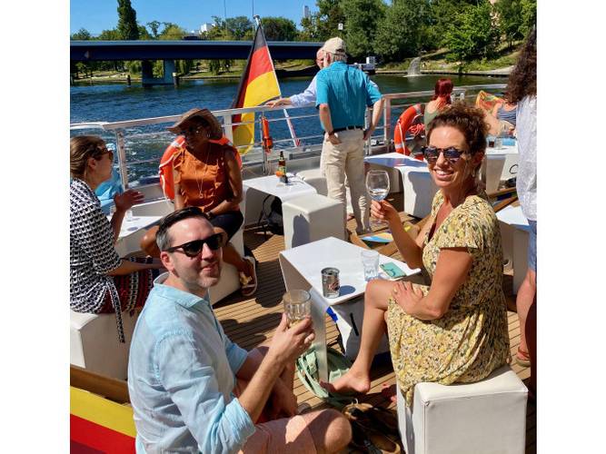 Genießen Sie eine kurze Ruhepause auf unserem emissionsfreien modernen Schiff und erfahren Sie alles Wissenswerte über Berlin, mit einem Drink in der Hand und einer entspannten Abendtour durch das Herz von Berlin!