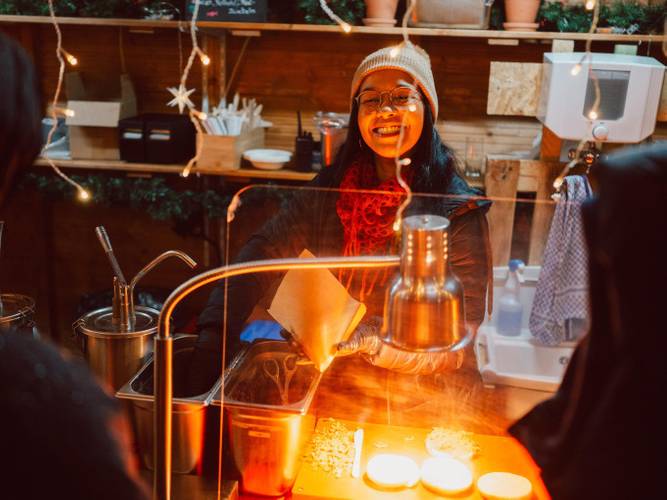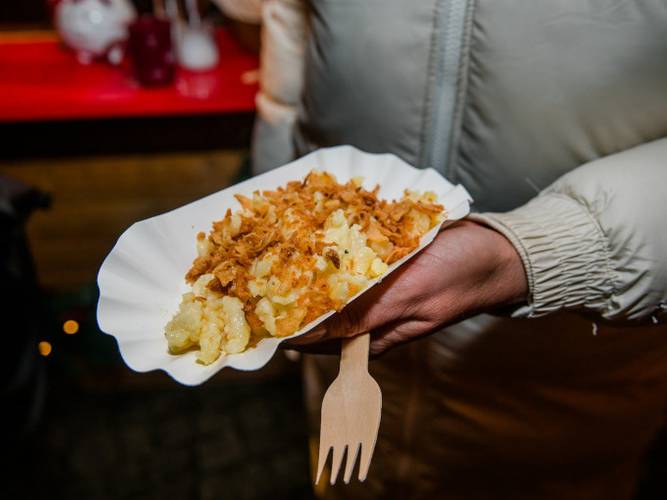 - Leberkäse und Rostbratwurst, Spätzle mit Gulasch oder Käse, Finnisches Flammlachs-Baguette mit Meerrettich-DillsaucePulled Christmas Pork Burger, Pilzpfanne, Chilli con Carne, Kürbissuppe, Laugenbrezeln, Crêpes, Waffeln, gebrannte Mandeln, Quarkbällchen, Germknödel mit Pflaumenragout
