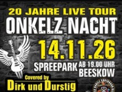 DAS WARTET AUF EUCH Onkelz Nacht im Sprrepark Beeskow Auch in diesem Jahr präsentieren wir euch zur 20 Jahre Live Tour die beste Onkelz Coverband Dirk und Durstig 100% authentisch, 100% laut und 100% Emotional Lasst uns gemeinsam eine unvergessliche... mehrzu: Onkelz Nacht - Dirk und Durstig |20 Jahre Live Tour